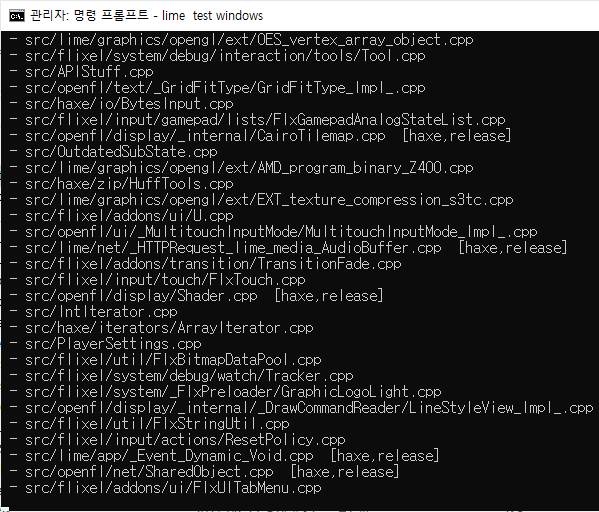 그리고 나서 일단 빌드를 하기 위한 명령어닌 lime build windows를 입력해 보았습니다. 이렇게 해서 작업을 이어가 보도록 했는데, 아직은 제대로 실행이 되지 않는 것을 확인할 수 있었습니다. 일단 여기까지 해 보도록 하고, 여기서 다음은 무엇을 해야 할지 일단 코드를 해석해야 하나 모르겠습니다.