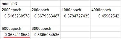 이렇게 해서 일단은 위 스크린샷에서 볼 수 있는 것처럼, 일단은 6000에포크의 기록이 가장 나아 보이기는 보입니다. 다만, 이렇게 하고나서도 어떻게 모델 1번의 기록을 깨지는 못 하고 있는 상황입니다. 아무튼 이에 대해서 그렇게 크게 생각은 할 수 없지만, 그래도 다음 포스팅에서 이상치 부터 어떻게 손 봐야 겠습니다.