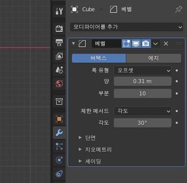 그리고 둥근 모서리를 만들기 위해서 위 스크린샷에서 보이는 것과 같이 일단 베벨이라는 모디파이어를 추가해 주도록 했습니다.