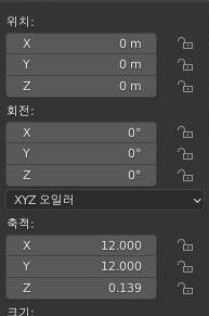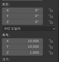 그리고 나서 X축과 Y축의 비율을 10으로 늘려놓은 평면을 추가해 주도록 합니다. 이렇게 하는 것으로 일단 가운데를 채워주고, 베벨을 육지에 모디파이어로 추가해서 안쪽만 둥글게 만들어 줍니다.