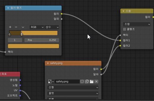 자료를 찾고, 그 다음에 어떻게 응용해서 노드를 연결을 바꾸어 보았습니다. 그러면서 여기다가 컬러 램프도 바꾸어 보도록 했습니다. 이렇게 해서 위 스크린샷에서 보이는 것처럼 나왔습니다.