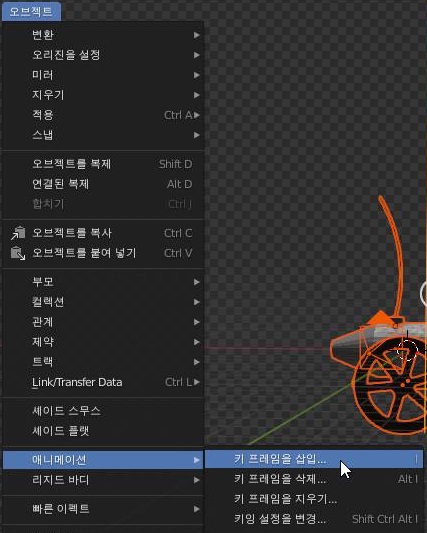 그리고 나서 위 스크린샷에서 볼 수 있는 것처럼, 일단 오브젝트 메뉴에 있는 애니메이션 항목이 있습니다. 그리고 나서 여기다가 키 프레임을 삽입이라는 것을 누르도록 합니다.