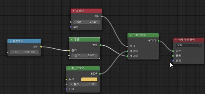 그리고 나서 메테리얼을 위 스크린샷에서 볼 수 있는 것처럼, 일단 하나하나 만들어 보았으며, 블랙보디 노트에서 온도를 설정해서 뜨거운 것처럼 보이도록 합니다.