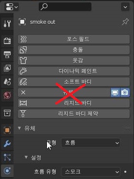 결국 꼬일 대로 꼬여서 하는 수 없이 연기가 나오는 오브젝트에 있는 유체항목을 피직스 프로퍼티스에서 제거해 주도록 해야 했습니다.