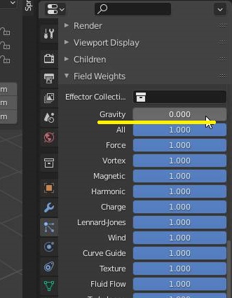 우선 위 스크린샷에서 보이는 field weights 항목으로 가서, 중력이라는 수치를 0으로 만들어 주도록 합니다. 이렇게 해서 다음으로 보면...........