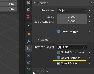 먼저 시도한 것은 렌더 항목으로 가서, 파티클 프로퍼티에서 오브젝트라는 하위 항목을 열어 주도록 합니다. 이렇게 하는 것으로 일단 field를 지정해 주도록 합니다.