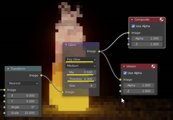그리고 나서 위 스크린샷에서 나오는 노드를 추가하고 나니까, 서서히 배경으로 보이는 픽셀이 어느정도 픽셀아트로 나오는 것을 확인할 수 있었습니다.
