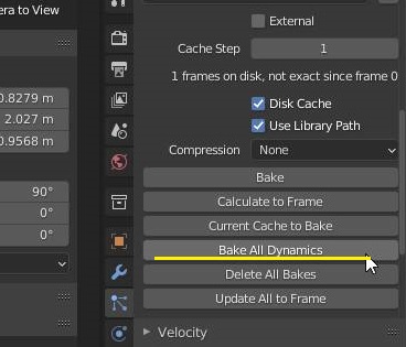 이 문제를 어떻게 하면 해결할 수 있느냐 하면, 위 스크린샷에서 볼 수 있는 것처럼, 베이크 (bake)라고 하는 과정을 거쳐야 했습니다. 이게 무슨 과정이냐 하면, 바로 메모리의 일부를 미리 할당해서 프레임 드랍을 미연에 막아주는 작업인데, 주로 파티클이나 cloth가 붙은 경우에 한다고 합니다.
