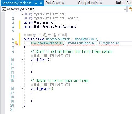그리고 여기서 핵심이 되는 것이라면 것이라고 할 수 있는 바로, 위 public 으로 선언이 된 변수 2개가 있는데, 일단 각각 조이스틱 패드와 스틱을 의미합니다.