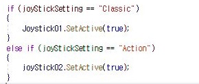 일단 다음 작업을 위해서, 무엇이 빠졌냐 하니, 바로 조이스틱의 형식을 선택하면, 그게 게임씬에서 반영될 수 있도록 만들어야 하는데, 그걸 하지 않았습니다.