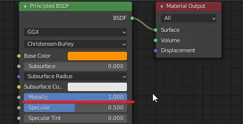 먼저 위 스크린샷에서 나오는 것처럼 거의 금색에 가까운 색상으로 Base color를 지정해 주도록 하고, 그 다음으로는 Metallic을 1이라는 최대치로 주도록 했습니다.