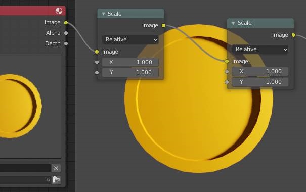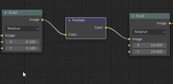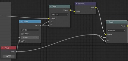 그리고 나서 다음으로 진행을 하고자 하는 것은, 역시나 스케일 이라는 노드를 2개 만들어서 처음에는 나누기를 하고 그 다음에는 곱하기를 해서 원래대로 돌아오는 것이지만, 이것만 가지고서는 픽셀아트화 되지 않습니다.