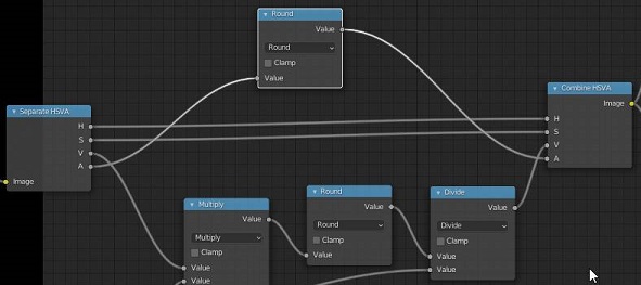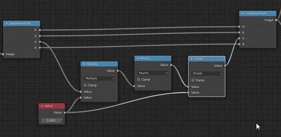 일단 전체적으로 다음과 같이 separated HSVA와 combine HSVA간에 3개의 math노드를 추가해서 각각 곱하기, 반올림에 해당하는 round, 그리고 다시 나누기로 어어집니다. 그리고 이 값들은 곱하기와 나누기에서 각각 value 노드로 관리가 됩니다.
