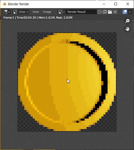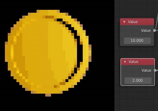 그렇게 해서 마무리로 위 스크린샷에서 볼 수 있는 것처럼, 일단 2개의 밸류값을 조정하는 것으로 완전한 3D 오브젝트인 금화를 제대로 픽셀아트화 시킬 수 있었습니다.