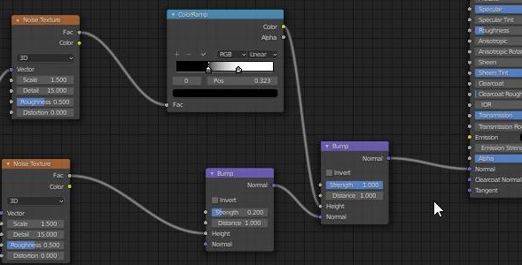 최종적으로 위 스크린샷에서 보이는 것처럼 노이즈 텍스쳐 2개에 어떻게 bump노드도 2개 만들어 놓아서 일단 principled BSDF에 연결을 해 주도록 합니다.