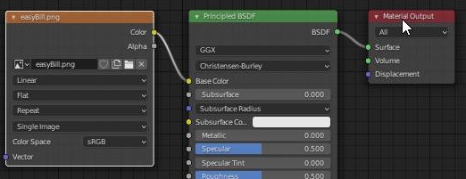 그리고 나서 쉐이더 노드를 생성한 다음에, 여기 보이는 principled BSDF에 이미지 텍스쳐를 입히도록 해 봅니다. 이렇게 하는 것으로 작업은 어느정도 되리라 예상을 합니다.