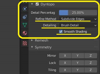그래서 자료를 검색해 보니, 위 스크린샷에서 볼 수 있는 것처럼, 일단 Dyntopo라는 항목이 체크되어 있지 않고, 설정도 되지 않아서 생기는 문제였습니다.