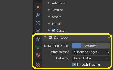 그리고 나서 잊지말고 이 Dyntopo설정을 해 주도록 합니다. Detail percentage는 설정하지 않아도 되지만, 아래에 Refine method는 subdivide Edges로 만들어 주도록 합니다. 그리고 나서 detail은 brush detail로 만들어 주도록 합니다. 그리고 나서 아래에 있는 smooth shading을 체크하는 것을 잊으면 안됩니다.