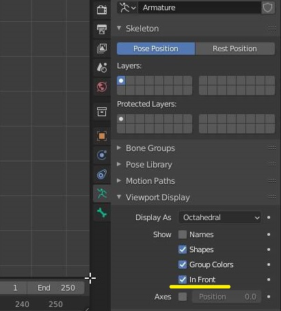 먼저 위 스크린샷에서 보이는 것처럼 뼈대로 보이는 항목으로 들어가서, 여기다가 뷰포트 표시 (Viewport Display)의 하위 항목으로 있는 In Front를 체크해서 아마튜어가 항상 보이도록 설정해 주도록 합니다.