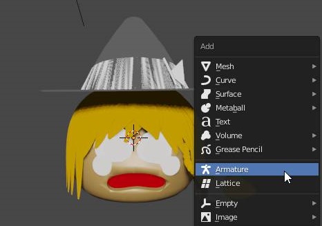 그래서 윳쿠리 마리사의 몸통 한 가운데로 3D 커서를 옮겨놓은 다음에 shift + a 키를 이용해서 추가시켜주는 오브젝트에 아마튜어(Amature)를 선택해 주도록 합니다.