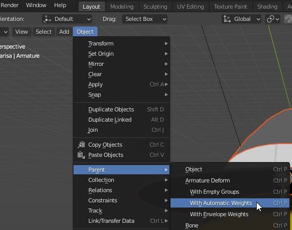 그리고 나서 위 스크린샷에서 보이는 것처럼 Automatic Weights라는 항목을 가지고서 parent를 시켜 주도록 합니다. 이러면 무슨일이 벌어 지는가 하면.......