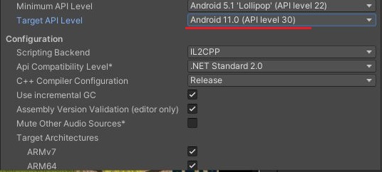 다른데서 정보를 찾아보니, 아예 목표 api를 30으로 낮추어라는 말이 있었습니다. 그래서 이에 따라 설정을 유니티 상에서 달리 해 줘 보았습니다.