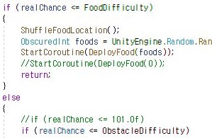 그렇게 해서 다음으로 해야 할 일로는 위 스크린샷에서 볼 수 있는 것처럼, 우선 확률에 대해서 한번 체크를 해보도록 하니까, 일단 무언가가 잘못 되어 있었습니다. <= 연산자가 아니라 == 연산자로 되어 있어서 음식이 나올 래야 나올 수 없는 상황이 되어 있었습니다.