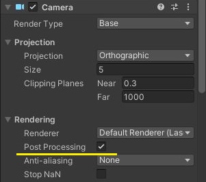 먼저 메인이 되는 카메라에 가서, 위 스크린샷에서 볼 수 있는 것처럼 우선 어떻게 해서건 간에 post processing에 대해서 한번 이야기를 해보고자 합니다.