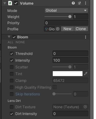 그렇게 해서 추가한 다음, 위 스크린샷에서 post processing을 통해서 bloom을 추가해 보도록 합니다. 그런데 여기서 강도를 100으로 준게 무언가 좋지 않기는 않습니다.