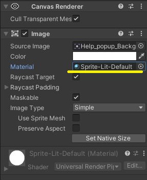 그리고 보니 미처 하지 않았던 것이 있는데, 일단 위 스크린샷에서 볼 수 있는 것처럼 우선 image의 머테리얼을 하나 바꾸어 주어야 했습니다. 그것도 sprite - lit - default로........