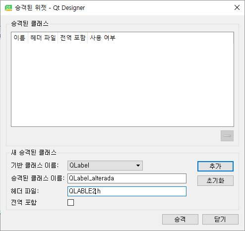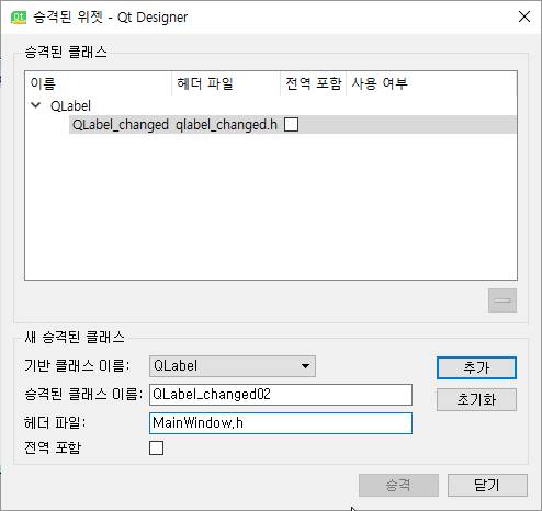 그리고 나서 본래의 메인 윈도우로 돌아와서, 위 스크린샷에서 보이는 것처럼 하나하나 만들어 주도록 합니다. 다만, 이 작업을 하면서, 하나 알 수 있는 것은 그 전에는 실패한 이유가 모듈이 없다 = 실은 py파일이 없다는 의미라고 할 수 있었습니다. 그리고 승격이라는 것이 바로 다른 클래스의 내용을 상속받는 위젯을 만드는 것이라고 할 수 있습니다.