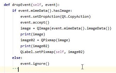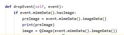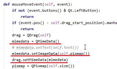 그래서 어디가 문제였는가 하니, 위 스크린샷에서 볼 수 있는 것처럼 이렇게 위젯간에 데이터 이동에 쓰이는 것으로 보이는 MimeData라는 것이 있는데, 여기서 이미지에 대한 데이터를 생성하지 않아서 생긴 문제였습니다.