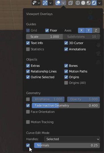 먼저 위 스크린샷에서 볼 수 있는 것처럼 커브 에디트 모드에서 normals 항목을 체크해 주도록 합니다. 이렇게 하나 만들어 주었다면, 이제 다음 작업에 들어가 보도록 합니다.