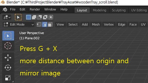 그리고 나서 에디트 모드에 종이에 해당하는 평면을 선택한 다음 들어가서, 위 스크린샷처럼 G키로 이동을 하는데, 축을 지정하고 나서, 평면 자체의 오리진에서 멀어질 수록 미러 이미지와는 오브젝트 모드에선 가까워 지는 역설적인 현상이 나오기 시작합니다.