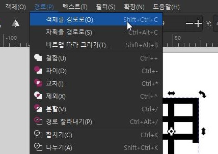 그리고 여기서 가장 중요한 과정인데, 경로 항목에 있는 객체를 경로로 라는 항목이 있습니다. 이걸 반드시 SVG파일마다 해 주어야 제대로 된 글자 모양이 나중에 블렌더에서 뜨게 됩니다.