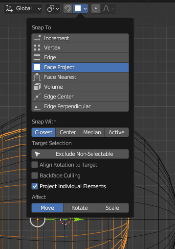 먼저 원형으로 모양을 잡은 다음에 윳쿠리의 몸통을 만들어 주기 위해서, 일단 앞쪽을 평평하게 만들어 주도록 합니다. 이런 작업을 하기 전에 Active Tool & work space setting에 대해서 Dyntopo항목을 체크해 주도록 하고, Refine method는 subdivide Edges로 설정해 주도록 합니다.