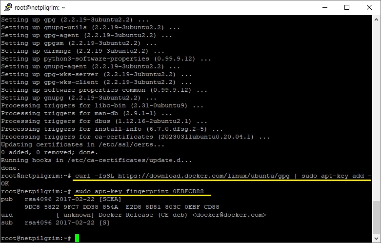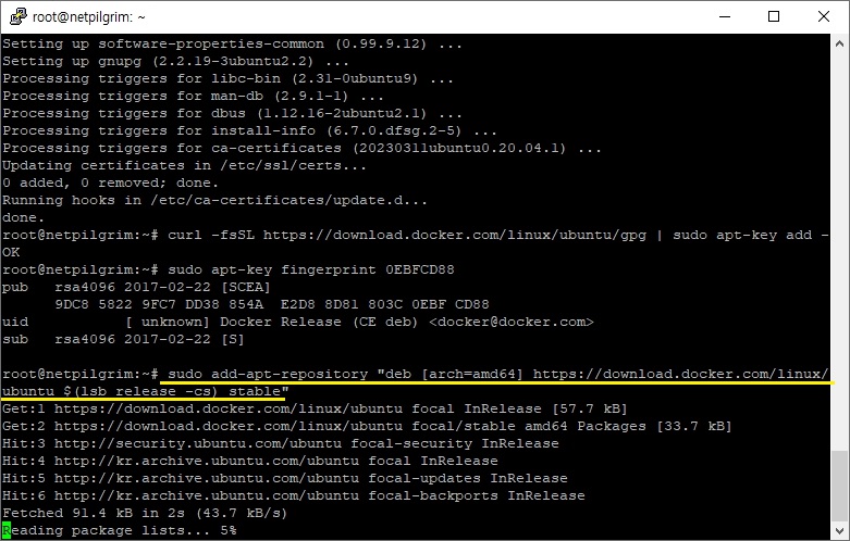그리고 나서 위 스크린샷의 노란색 선에 있는 명령어를 입력하는 것으로 정확하게 무엇무엇인지는 모르지만, 일단 도커를 가지고 놀기 위한 보조적인 프로그램들을 설치 하도록 합니다.