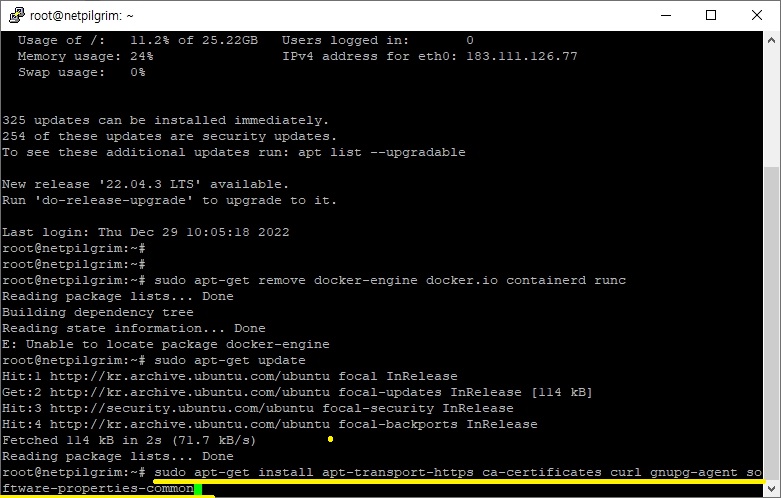 먼저 책에서 본 것처럼 명령어를 putty 터미널을 통해서 일단 연결해 주도록 합니다. 가장 먼저 입력한 것은 apt를 업데이트 한 다음에, docker 자체를 설치하는 것 부터 먼저 했습니다. 이전에 먼저 한 것으로는 기존에는 Centos 7을 사용한 것에서 그냥 우분투 리눅스를 그대로 설치해서 다시 시작하고자 합니다.