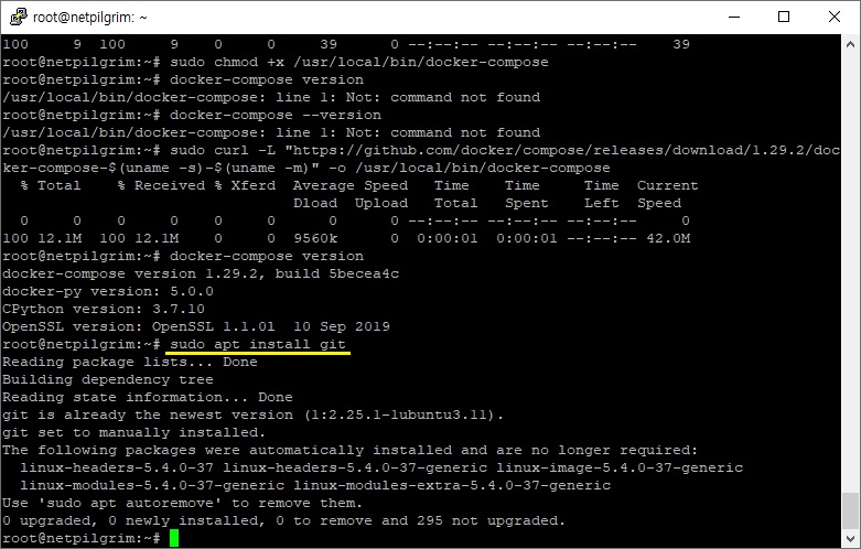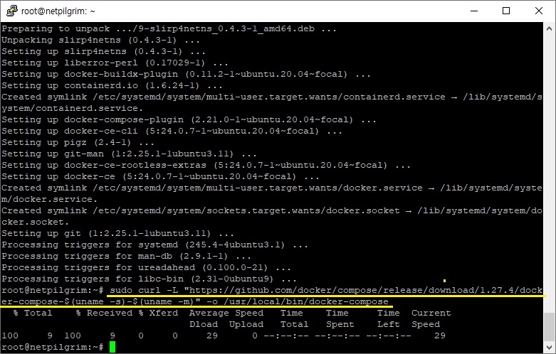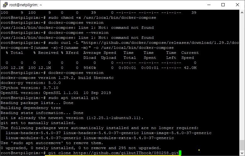 다음으로 실행한 것은 바로 docker라는 것을 설치하기는 했지만, docker-compose라는 것을 설치한 것 까지는 아닌 상황입니다. 이런 상황에서 책을 보고서 먼저 설치하기 위해서 위 스크린샷과 같은 명령어를 입력했습니다.
