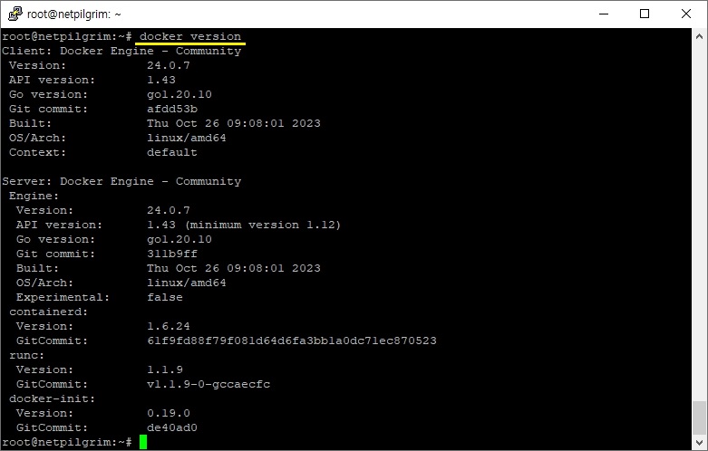 이제 제대로 설치가 되었는지 확인할 차례입니다. 이 작업을 하기 위해서 먼저 docker version이라는 명령어를 입력해서 제대로 내용물이 나오는 것을 확인하였고, 이로서 도커 자체는 제대로 설치가 되었다는 것을 확인할 수 있었습니다.