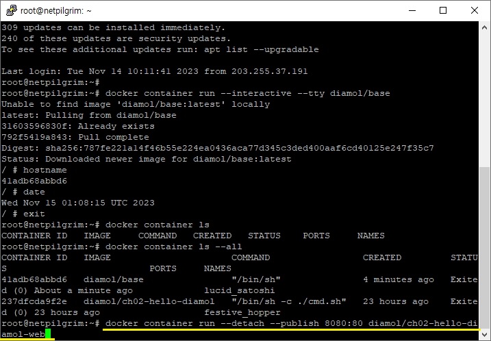 이제 다음으로 진행할 것으로는 위 스크린샷에서 보이는 것처럼 컨테이너를 백그라운드에서 실행하라고 --detach라는 명령어를 입력한 다음에 포트 번호까지 연결해서 어떻게 작동이 되도록 만들어 봅니다.