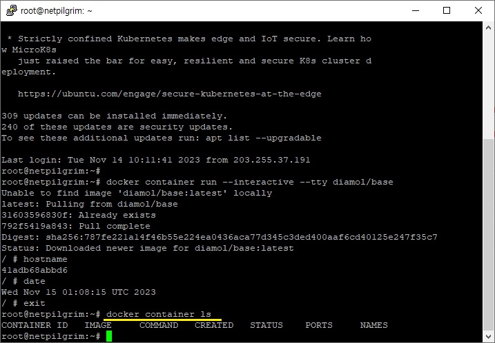 그리고 나서 exit로 빠져나온 다음, 현재 작동하고 있는 컨테이너가 있는가 봤더니, 일단 이렇게 실행만 시킨 경우에는 없다는 것을 확인할 수 있었습니다. 그냥 빠져나온 경우에는 어떻게 할 수 없는 것으로 보입니다.