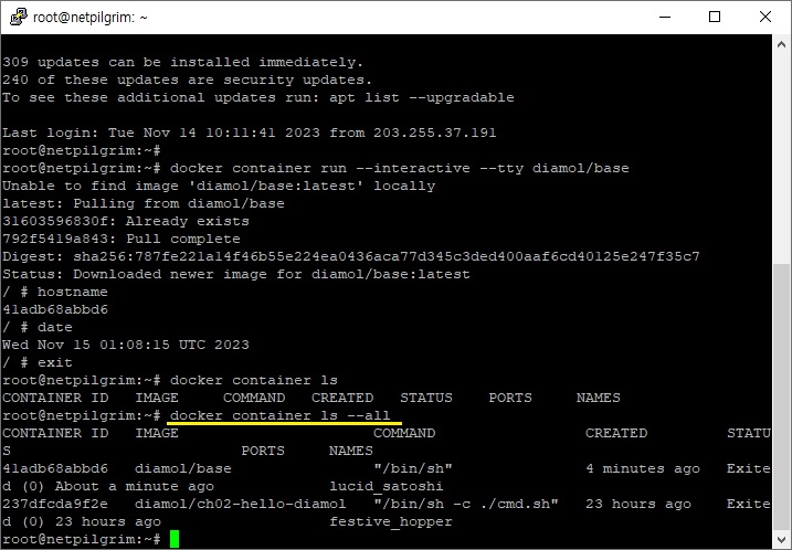 그런데 리눅스에서 ls라는 명령어를 쓰면서 뒤에 옵션으로 --all이라는 것을 붙이는 것으로 어떻게 해서 모든 컨테이너가 종료된 것 까지도 다 띄우라는 명령을 내릴 수 있어 보입니다.