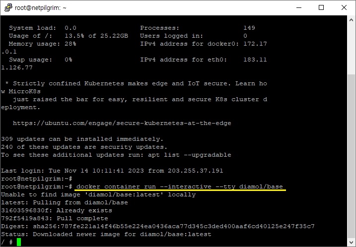 먼저 위 스크린샷에서 보이는 것처럼 컨테이너를 실행시키고자 하는데, 대화형으로 상호작용할 수 있는 형태가 있다고 합니다. 그런 형태로 한번 실행시켜 보도록 합니다.