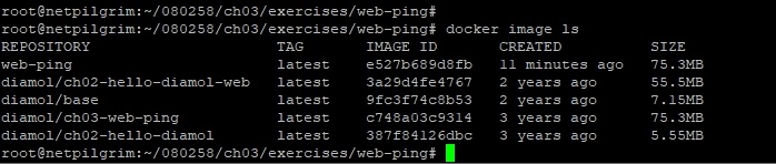 이제 도커에서 이미지를 검색할 수 있는데, 리눅스의 ls 명령어 처럼, 'w*' 라는 옵션은 다른게 아니라 w라는 이니셜로 시작하는 이미지를 도무 보여 주라는 의미가 됩니다. 그리고 방금 만들어 준 web-ping이라는 이미지가 있다는 것을 알려 주고 있습니다.