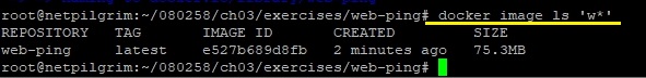 이제 도커에서 이미지를 검색할 수 있는데, 리눅스의 ls 명령어 처럼, 'w*' 라는 옵션은 다른게 아니라 w라는 이니셜로 시작하는 이미지를 도무 보여 주라는 의미가 됩니다. 그리고 방금 만들어 준 web-ping이라는 이미지가 있다는 것을 알려 주고 있습니다.