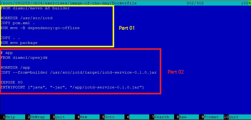일단 지난번 포스팅에서도 설명을 했다시피, 이 Dockerfile은 두 부분으로 나뉘어 져서 실행이 됩니다. 일단 여기까지가 책에서 나와 있는 설명이었고, 다음으로 넘어가 보도록 합니다.