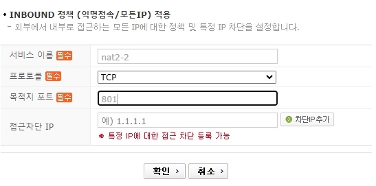 익명접속을 하는 모든 IP를 대상으로 해서, 위 스크린샷에서 볼 수 있는 것처럼 하나하나 만들어 주도록 합니다. 당연 여기서는 포트를 801을 열어주도록 합니다.