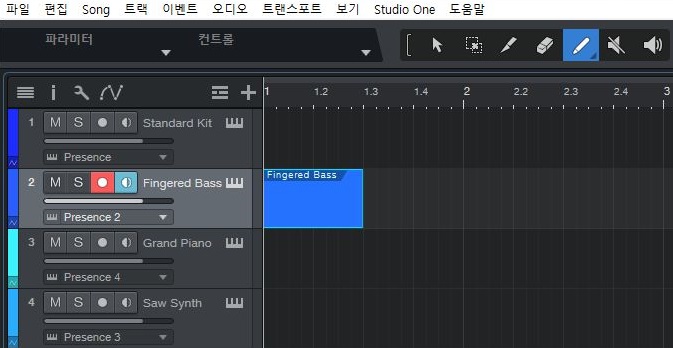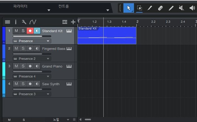 일단 악기를 배치했으면 이제 악보를 그려야 할 차례인데, 이를 하기 위해서 먼저 위 스크린샷에서 볼 수 있는 것처럼 일단 연필을 선택해서 일정 간격을 드래그 해서 한번 지정하도록 합니다. 일단 여기서 주의해야 할 점은 이 영역은 박자이지, 절대로 시간이 아니라는 겁니다. 전 그것도 모르고 일단 박자 단위로 이걸 지정했습니다.