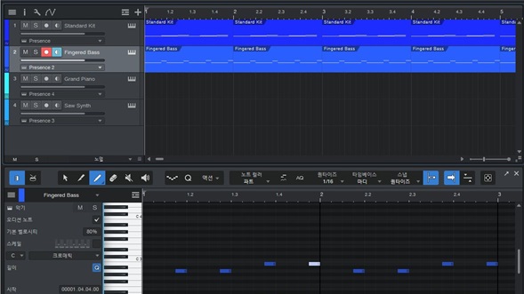 그리고 나서 다음으로 해야 할 것으로는 이번에는 분위기를 만들기 위한 베이스의 반복되는 음을 만들어서 무언가가 더 흥겨워 지는 것이 맞는지 모르겠습니다만, 만드는 저는 흥겨워지는 리듬을 만들어 보도록 합니다. 이렇게 하는 것으로 어느정도 무언가가 진행이 됩니다만, 그래도 부족한 것이 있으니, 일단 책의 마지막 부분을 다 읽지는 못 했다는 것이 있습니다. 시간이 날 때 마다 틈틈히 읽어서 어떻게 이번에는 엉터리 곡을 하나 만들어 보고자 합니다.